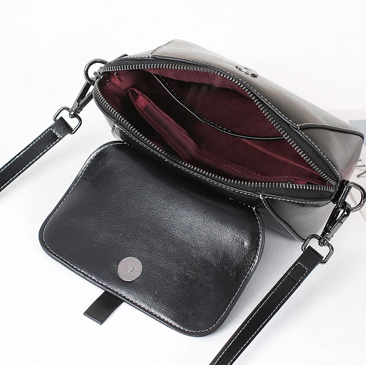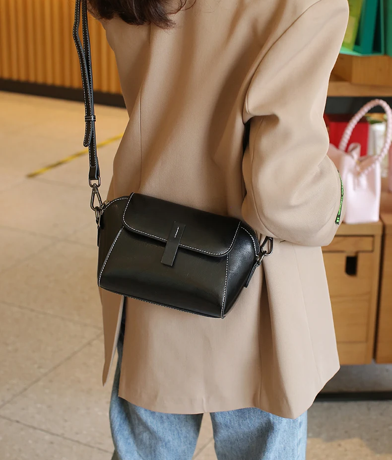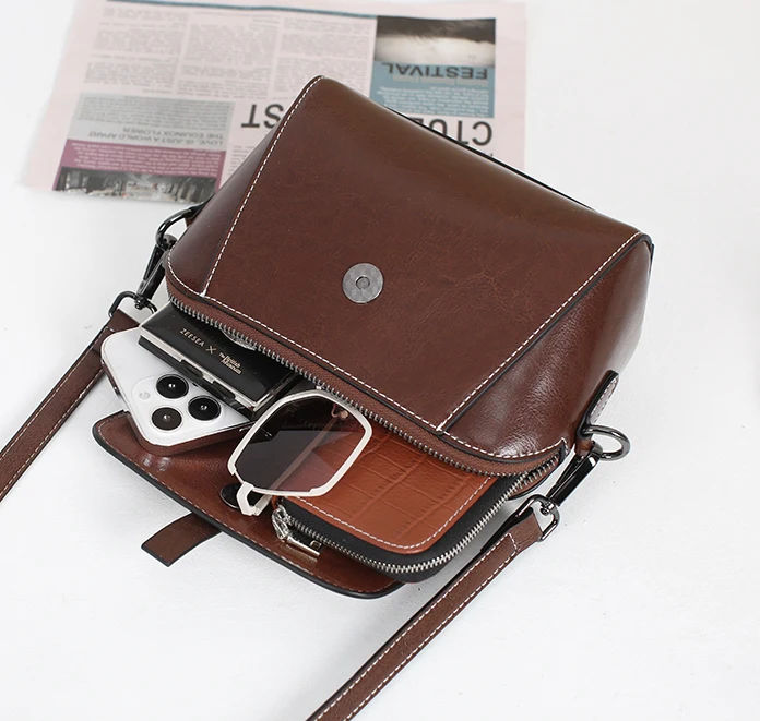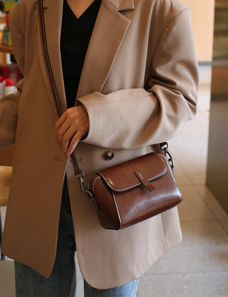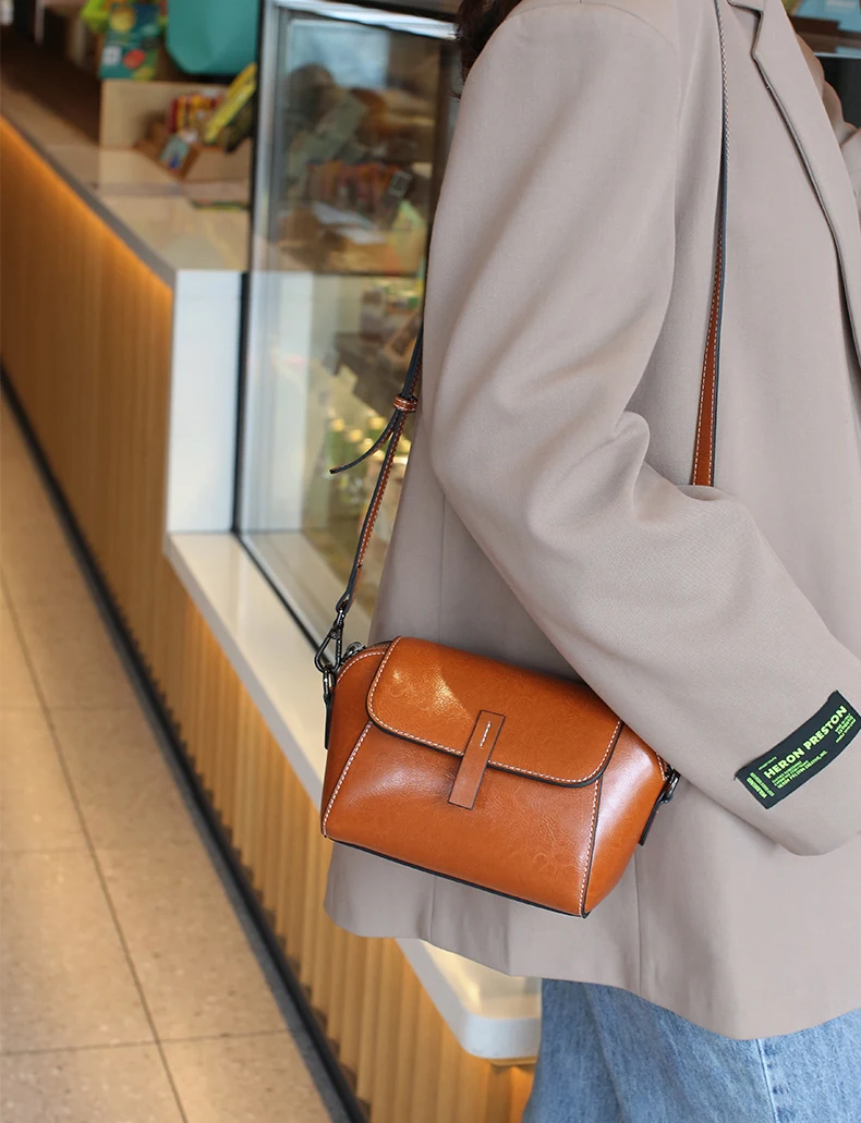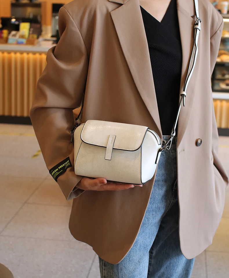 Hakiki inek derisiyle üretilen bu şık crossbody çanta, doğal görünümlü ve yumuşak dokulu.