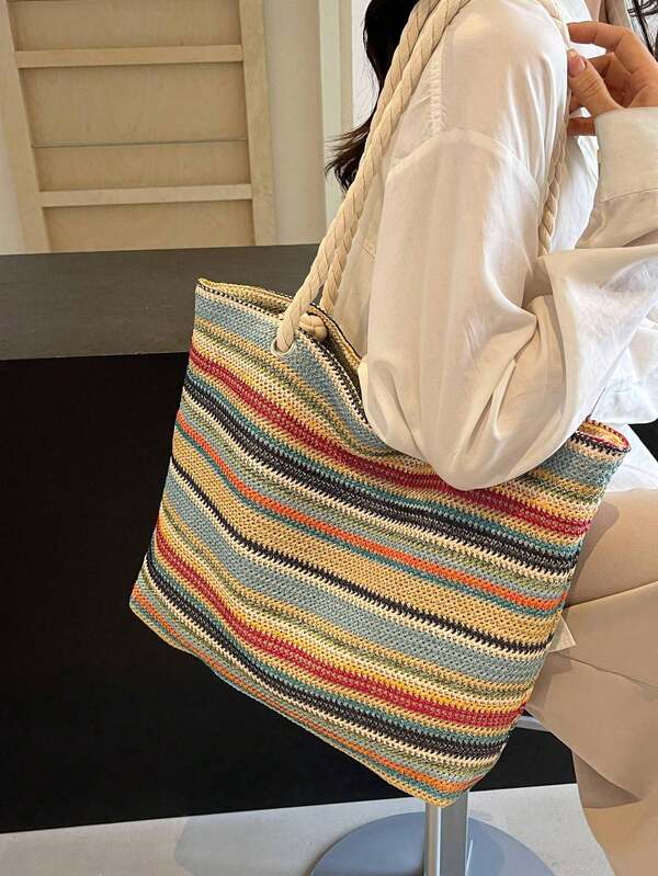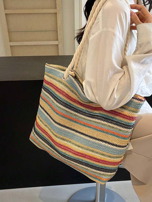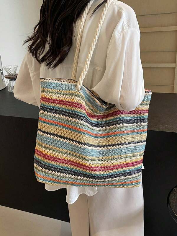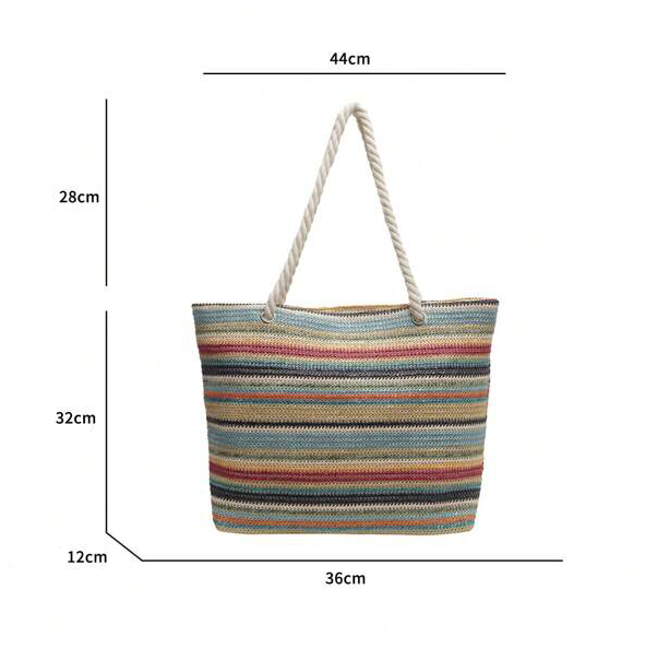 Un bolso de tela espacioso que puedes usar cómodamente tanto en la playa como en tu día a día. Con su estampado colorido, te adaptarás a la energía del verano. Al ser multicolor, combinará fácilmente con cualquier atuendo y te ahorrará la molestia de planificar qué ponerte.