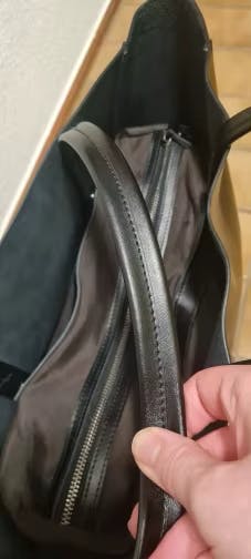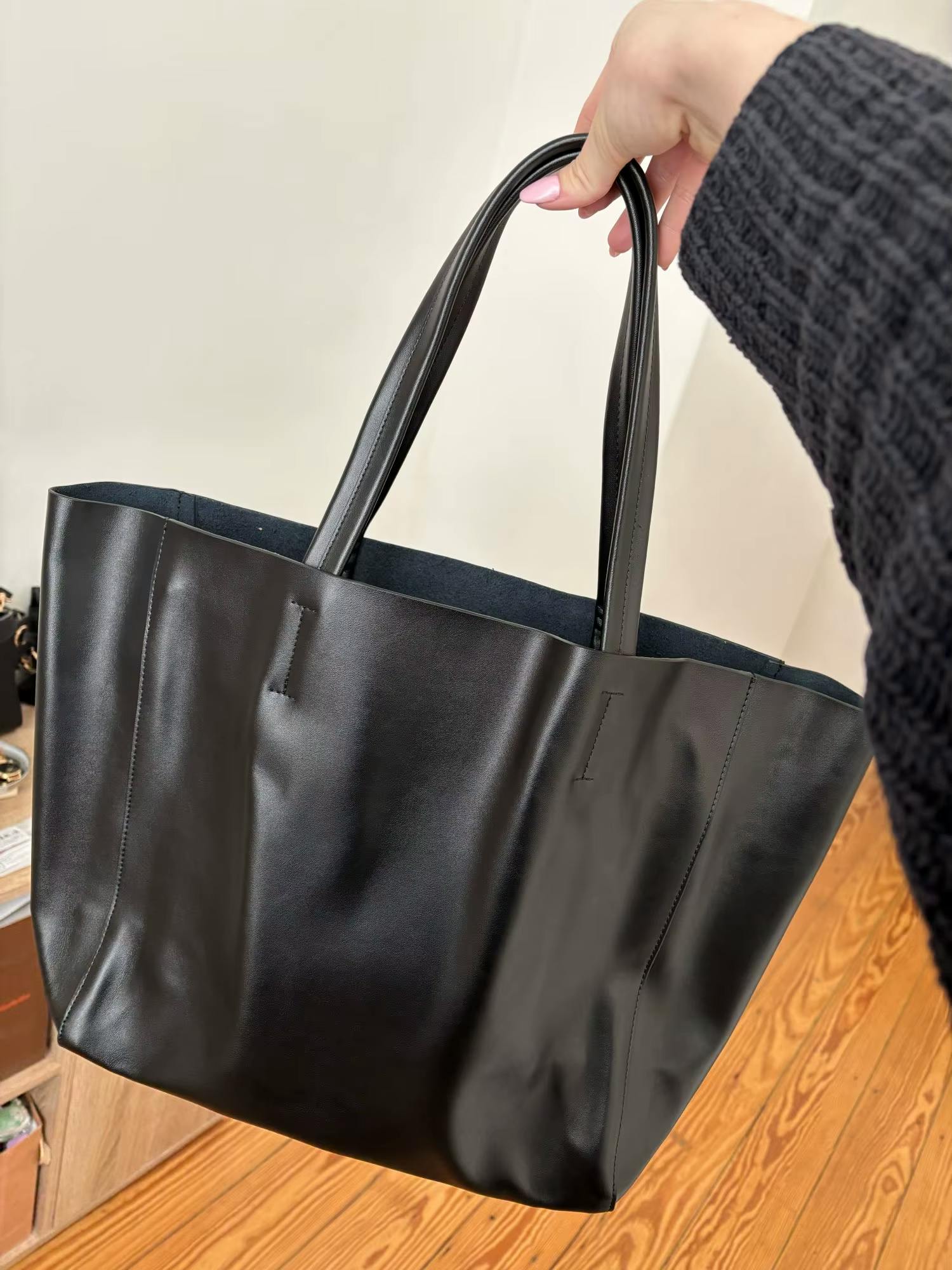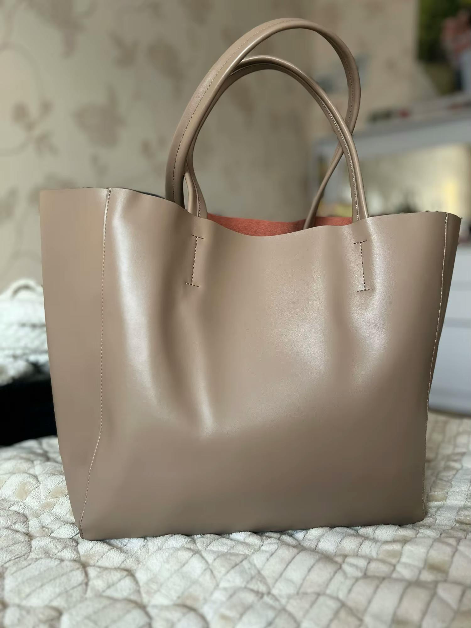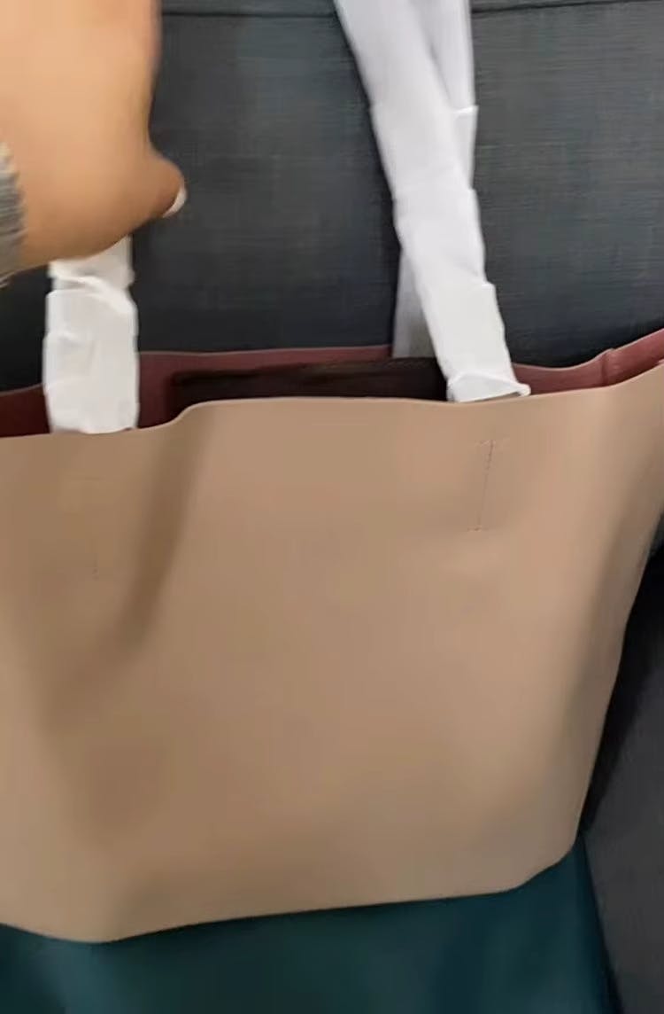 The bag is made from fairly thick, smooth leather, keeps its shape, and is a bit heavy. The stitching is strong, with high-quality craftsmanship. The inner bag is removable and about two-thirds the size of the main bag. The straps are comfortable and can be worn on the shoulder, though it might be a bit tricky with oversized outfits.