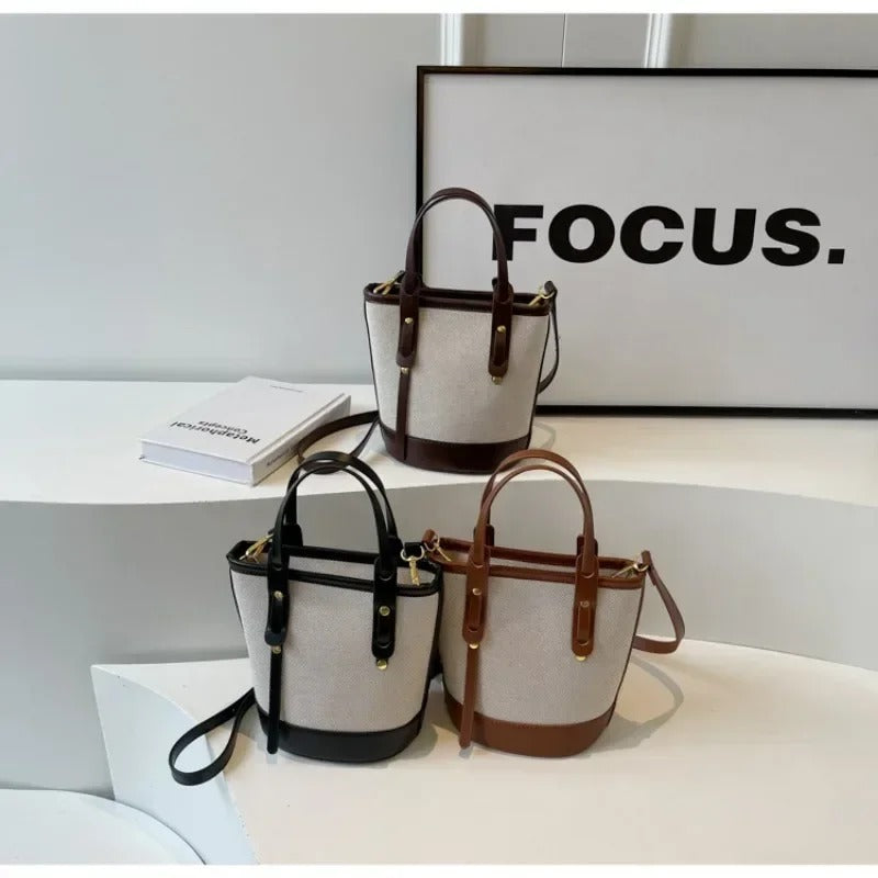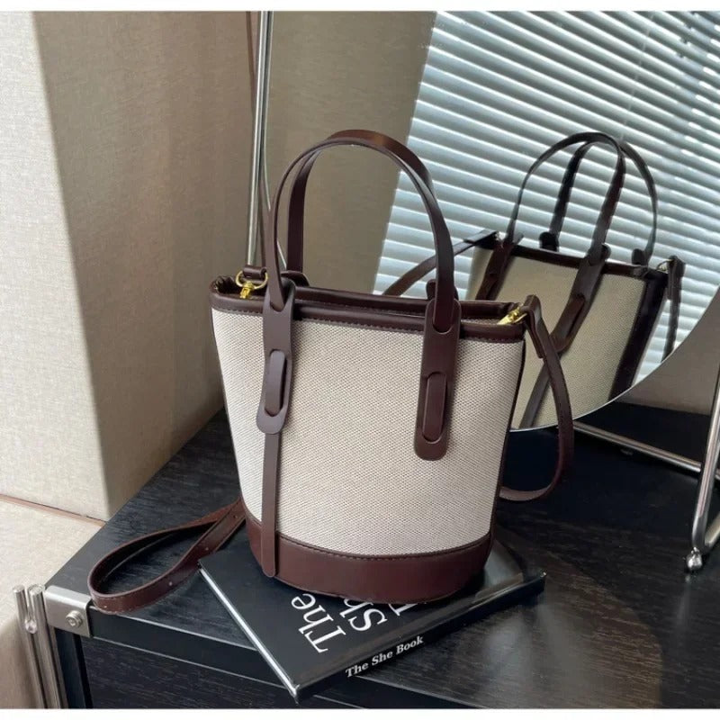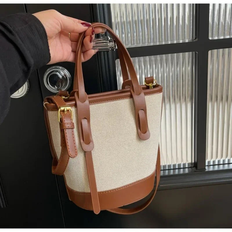 Este versátil bolso tipo saco, confeccionado con elegante polipiel y lona, aporta un toque de sofisticación práctica a tu día a día, ya que se puede llevar tanto al hombro como cruzado. Su diseño minimalista con un toque retro se alinea con las tendencias de 2025.