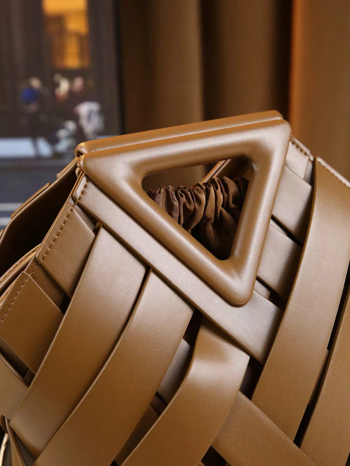Şıklığı ve özgünlüğü sevenler için tasarlandı! Ters üçgen şekilli dokuma sepet çanta, high-end niş tasarımı ve banliyö tarzı çizgileriyle fark yaratıyor. Özenli dokuma işçiliği ve premium malzemesiyle günlük stilini zarif bir dokunuşla tamamlıyor. Tote formu ve geniş iç hacmiyle günlük ihtiyaçlarınızı rahatça taşıyabilir, şık tasarımıyla her mekanda dikkat çekebilirsiniz.